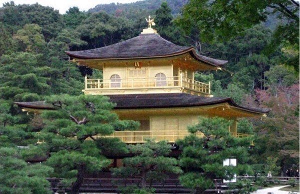 Eredetileg sógun villája volt, később kolostorrá alakították át. A mesterséges tó partján álló háromemeletes épületet aranyfüstlemezek borítják, tetejét főnixmadár díszíti. Az eredeti épületet 1950-ben egy őrült szerzetes felgyújtotta (Mishima Yukio: Aranytemplom c. művében megtalálható a történet részletes leírása).