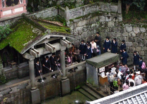 A név a három forrásra utal, amely a templomegyüttes területén található. Mindegyik forrásnak más és más jelentősége van. A forrásokból inni kell, ugyanakkor a hagyomány szerint nem szabad mind a háromból egyszerre, hiszen az telhetetlenségre utal. Ittam is kettőből, de sajnos nem tudom, hogy melyik minek a forrása volt, hiszen nem volt megjelölve. (Remélem, hogy a szépség és a bölcsesség forrásából sikeredett, vagy ez a kettő nem fér meg együtt?) A japán higiéniával itt is találkozhattunk, a fémpoharakat ultraibolya sugarakkal fertőtlenítették, mielőtt valaki használta volna őket.