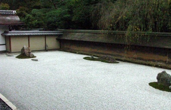 A Ryoanji templom – magyarul „Békés Sárkány”- az 1400-as évek közepén épült, a rindzai zen-buddhista iskola alapította. (Ma is aktív kolostor működik itt.) Világörökséggé vált sziklakertje egyedülállóvá teszi. A 30X10 méteres kertet 3 oldalról falak veszik körül, a negyedik oldalon egy fából készült tornác húzódik végig, szintén 30 méter hosszan a kert mentén. A kert tizenöt sziklája a fehér kaviccsal borított területen különböző méretű, öt különálló csoportban helyezkedik el.
