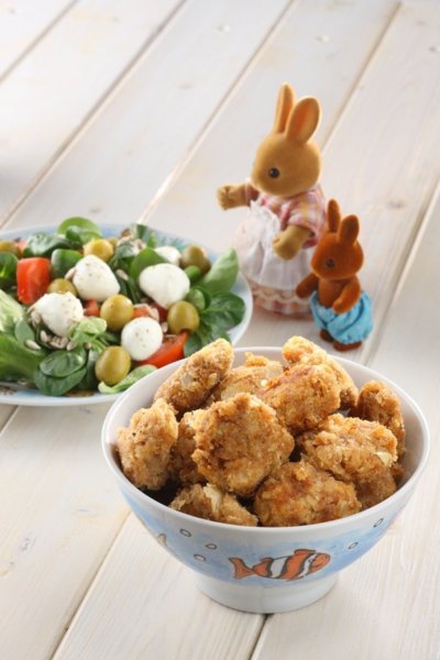 A hagymát apróra vágjuk, a halat lecsöpögtetjük, villával összetörjük. A fokhagymát összezúzzuk. A halat a hagymákkal összekeverjük, fűszerezzük, hozzáadjuk a paradicsomot, a sajtot a tojást, legvégül pedig a pankot. Az egészet összekeverjük, és vizes kézzel pinpong labda nagyságú golyókat formázunk belőle és forró olajban kisütjük. Sütés közben fordítsuk meg, hogy mind a két oldala átsüljön. Papírtörlővel bélelt tányérra szedjük, és miután lecsöpögött a felesleges olaj, utána tálaljuk a salátával.