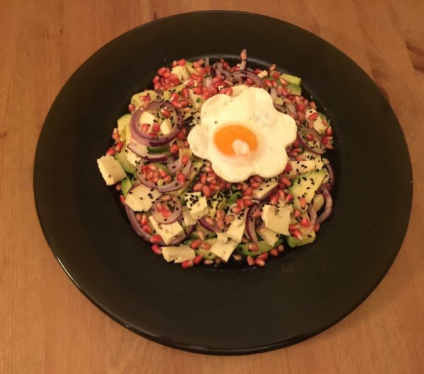 A gránátalmát megpucoljuk. (Technikák itt és itt.) A hagymát megpucoljuk, felkarikázzuk. A sajtot kockára vágjuk. A citromot kifacsarjuk. Az avokádót megpuculjuk, felkockázzuk. A hozzávalókat egy salátástálban összekeverjük és meglocsoljuk citromlével. Tetszőlegesen tükörtojással tálaljuk.