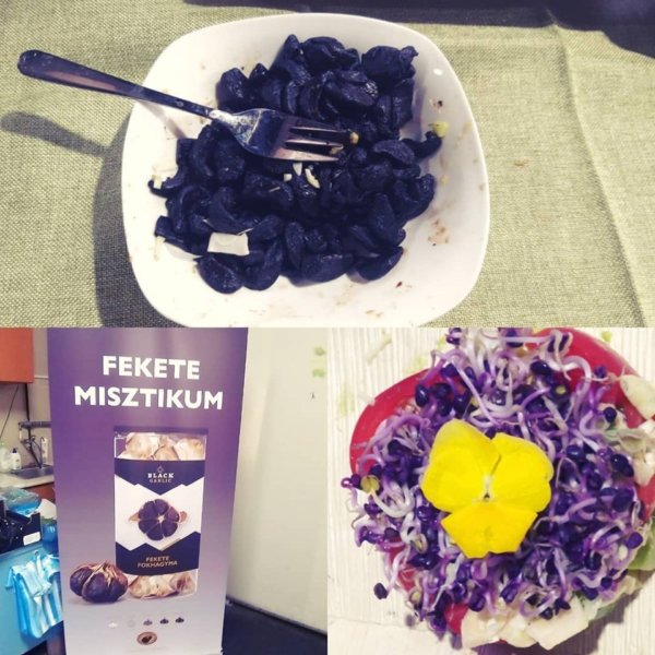 A fekete fokhagymát és a belőle készült umami salátát is kóstoltam. Az ízben és színben aszalt szilvára emlékeztető különlegességet Kínából hozzák, légmentesen zárható csomagolásban, így minőségét sokáig megőrzi. A titok: a fokhagymákat 80 °C fokon fermentálják. Az eljárás során nemcsak karakteres illatát veszíti el a fokhagyma, hanem puha is lesz; az öregedésgátló és egészségmegőrző hatása pedig jelentősen megnövekszik. A salátába a speciális fokhagymán kívül avokádó, retekcsíra, paradicsom és pálmaszív került. A díszítés pedig ehető virág volt. (Egyelőre még az is importáru, pedig van benne fantázia.) Az ízeket ezután szecsuán virággal semlegesítettem. Nem is tudtam, hogy a külsőre kamillára emlékeztető növény szétrágásával mire vállalkozom, zsibbasztó hatást vált ki. Az igaz, hogy bő tíz perc múlva -tiszta lappal- újra lehet kezdeni a kóstolást.